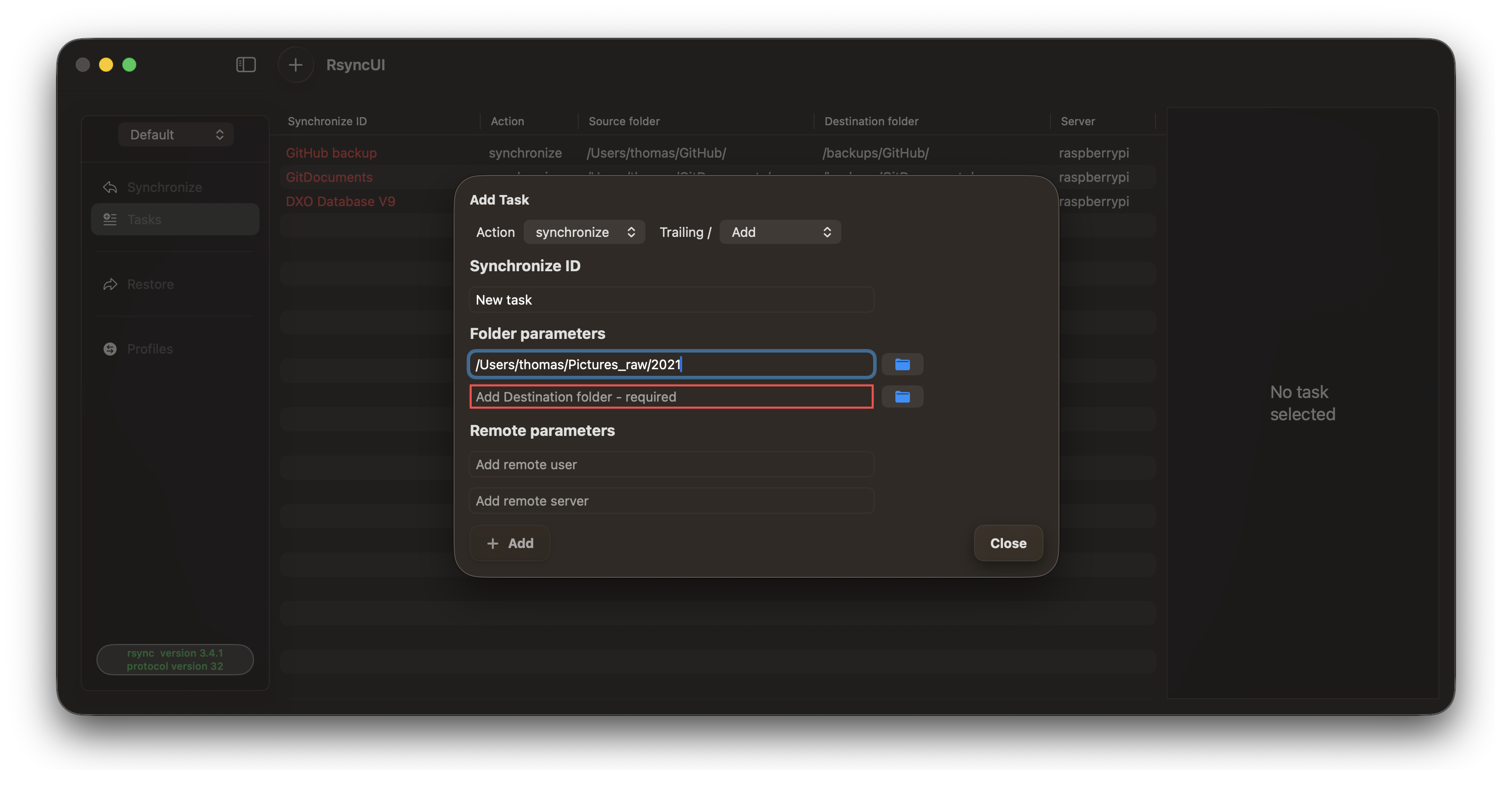 How to add, edit, and manage tasks in RsyncUI. Always verify a new task with a --dry-run before executing it.