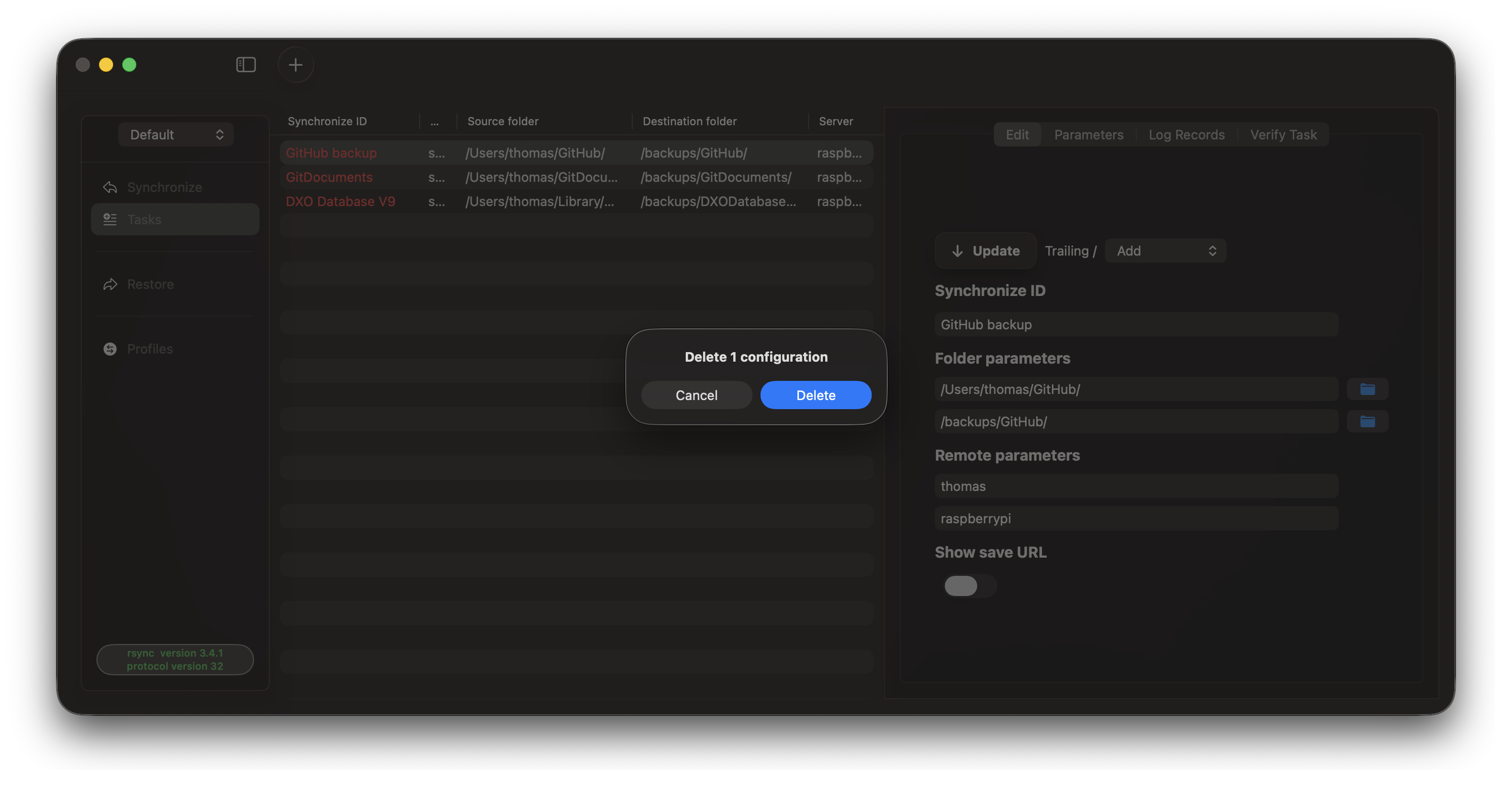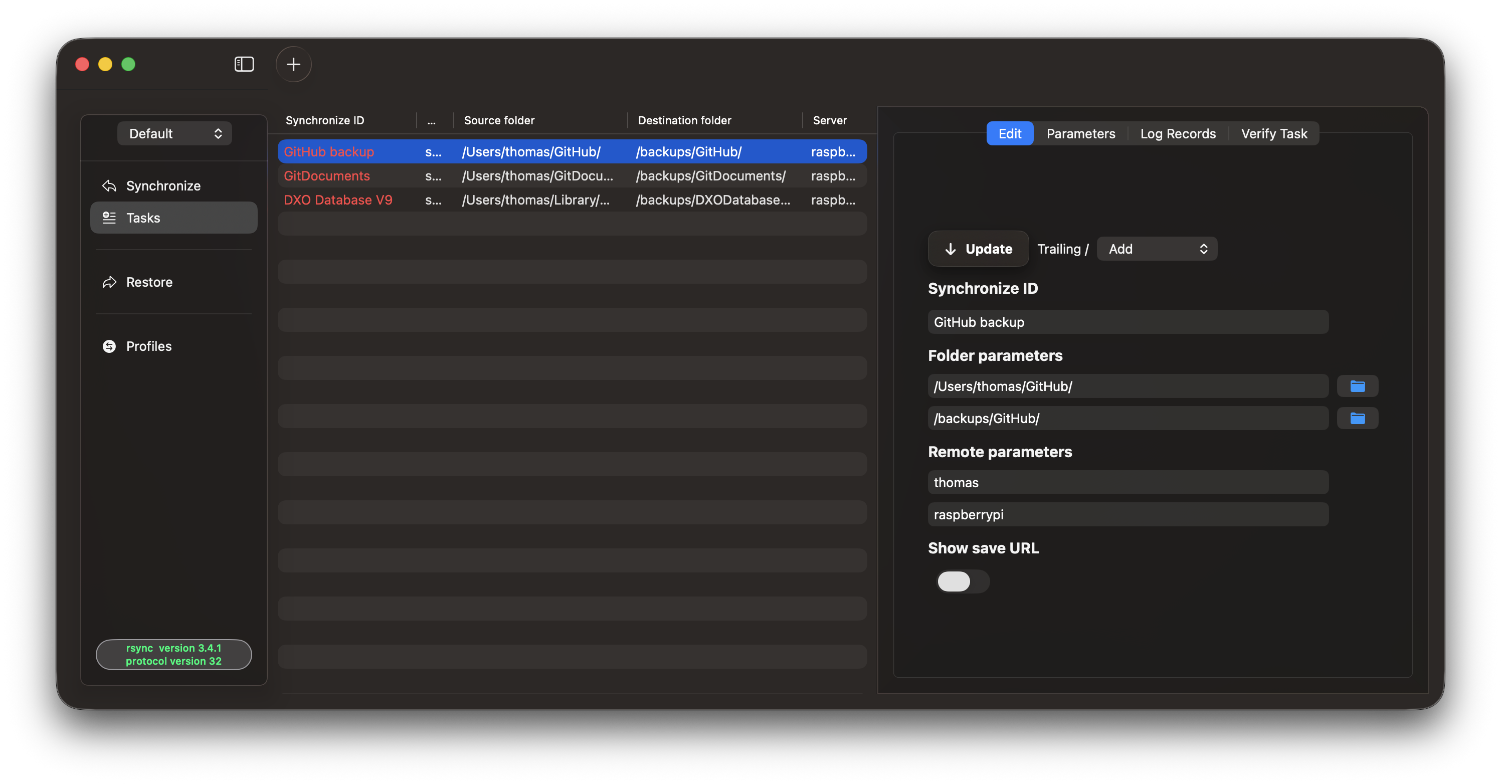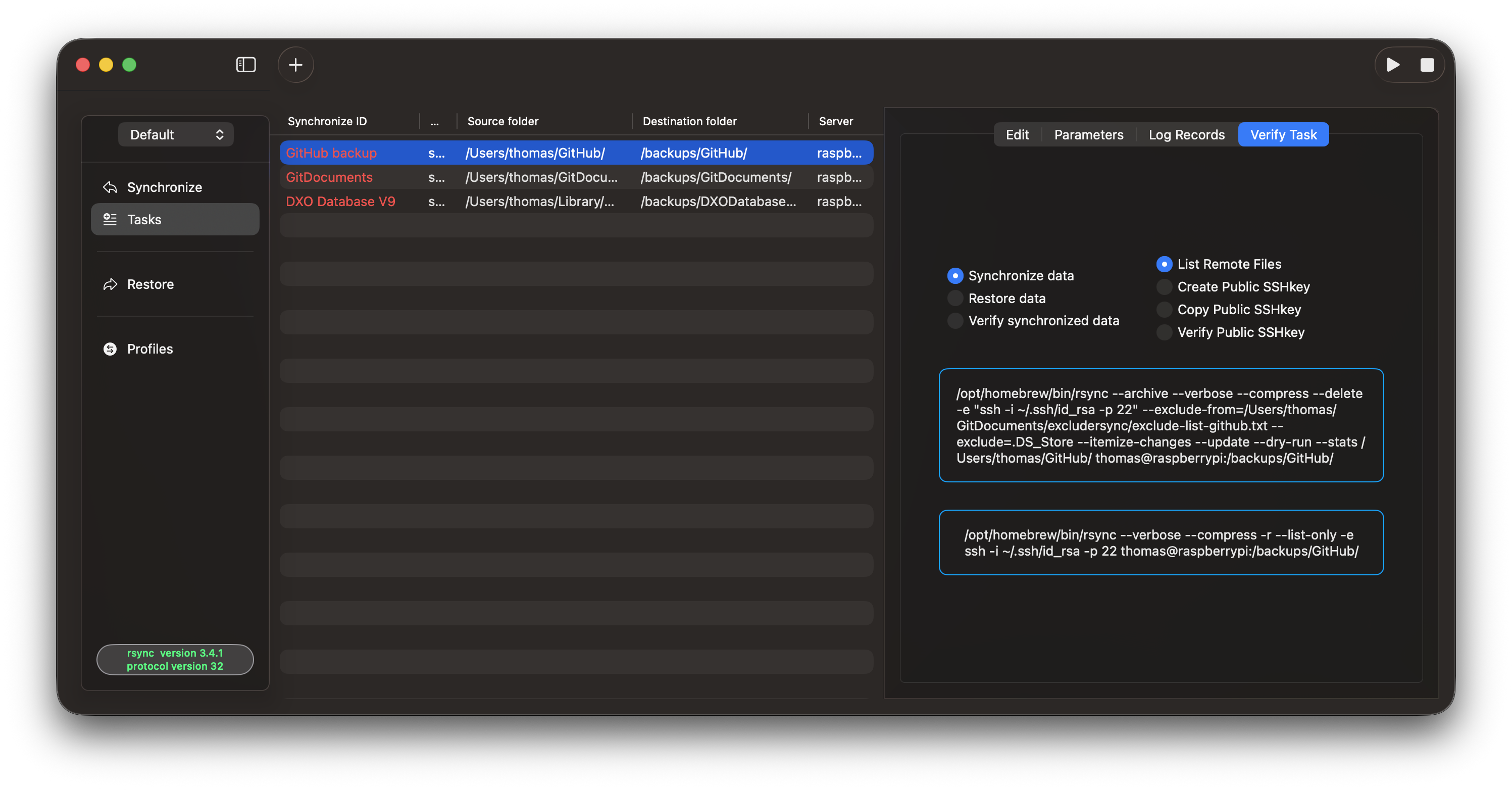Always verify a new or changed task. After adding or editing a task, or after changing rsync parameters, select “Verify tasks” from the primary Sidebar menu.