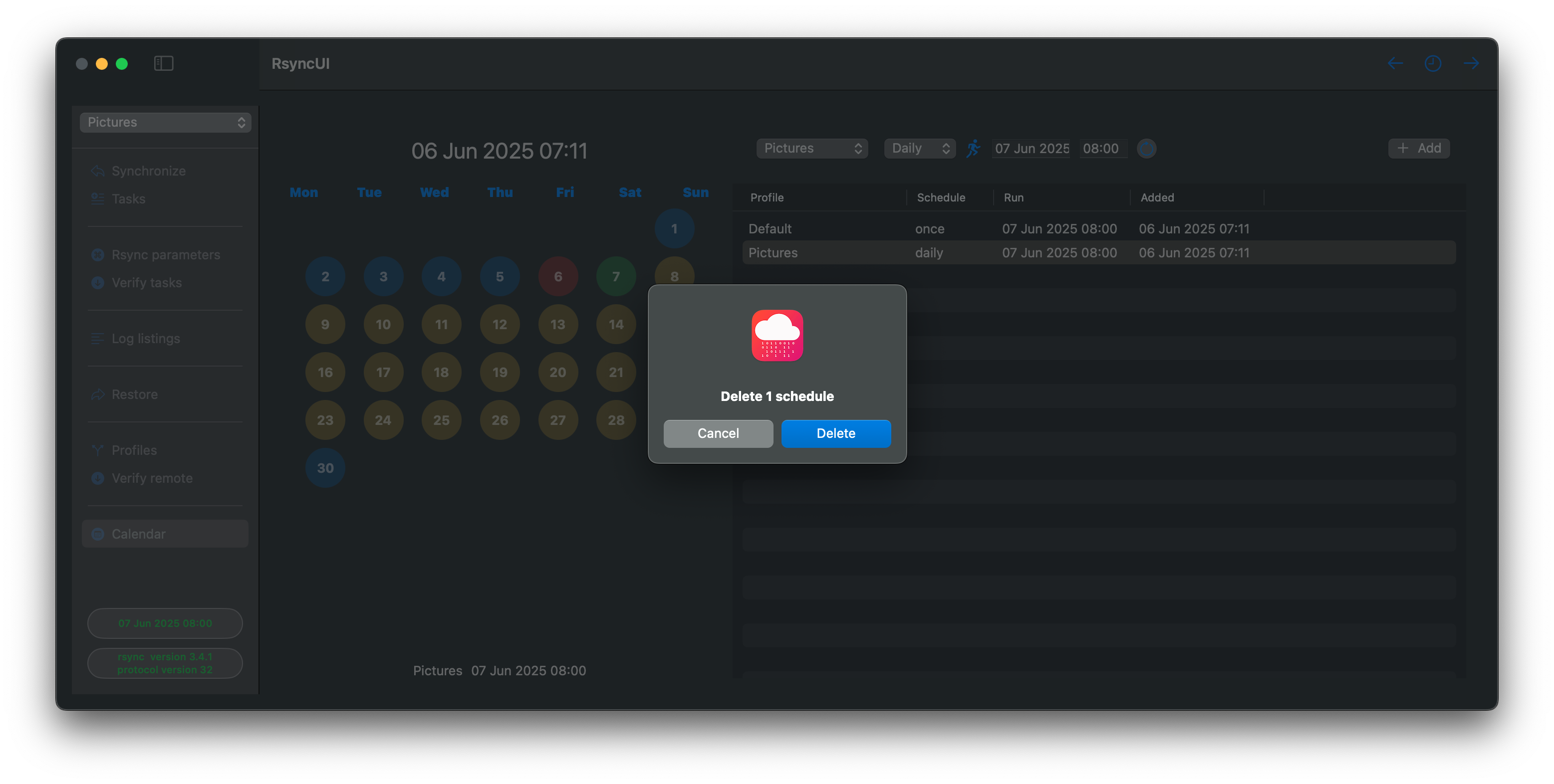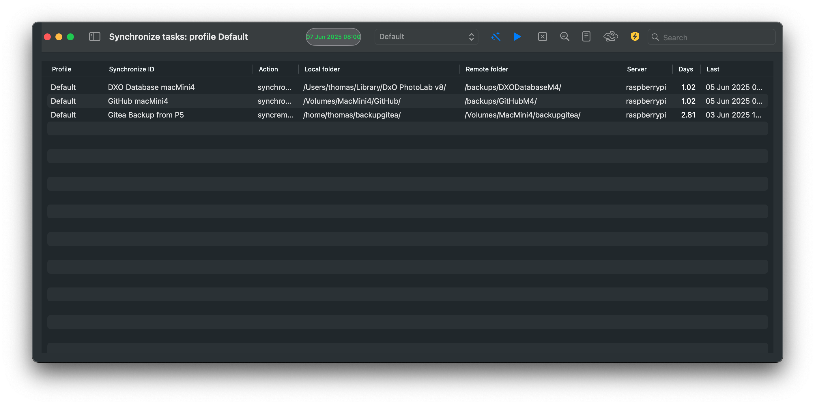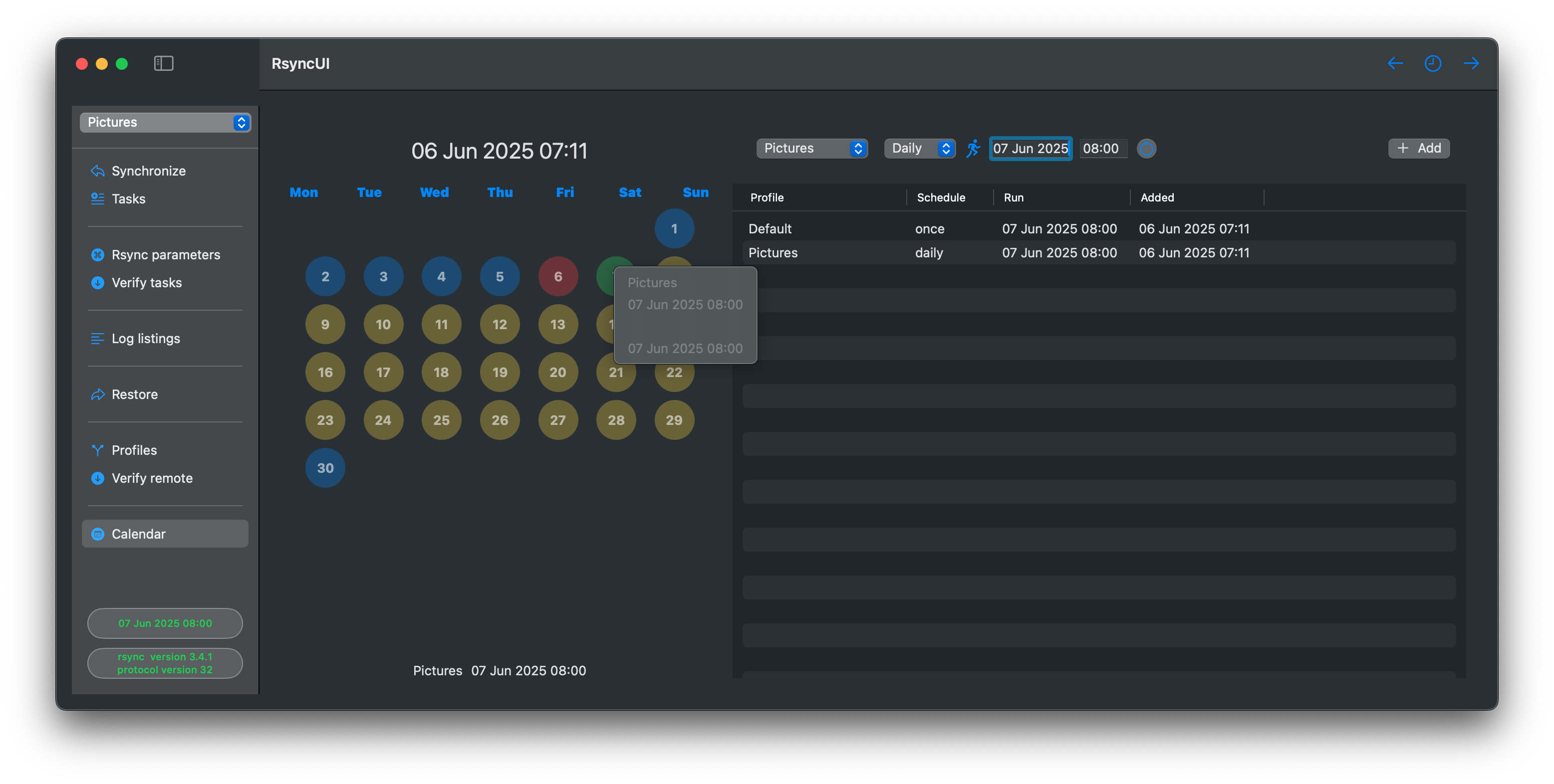 The scheduler automates chosen tasks while RsyncUI is running and you are logged in. If the Mac sleeps and a scheduled task is missed, it will be listed in the Schedule view after the Mac wakes.