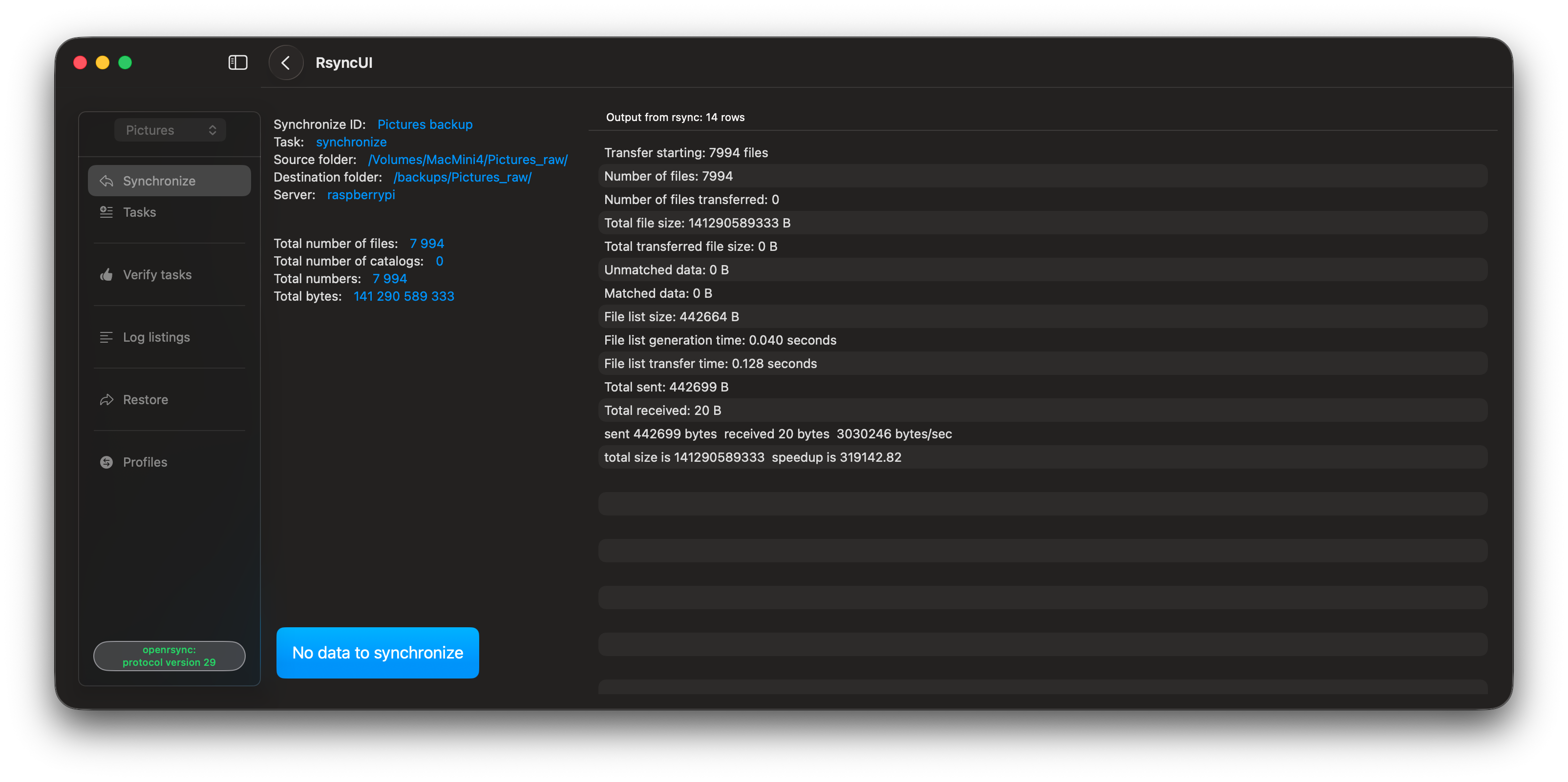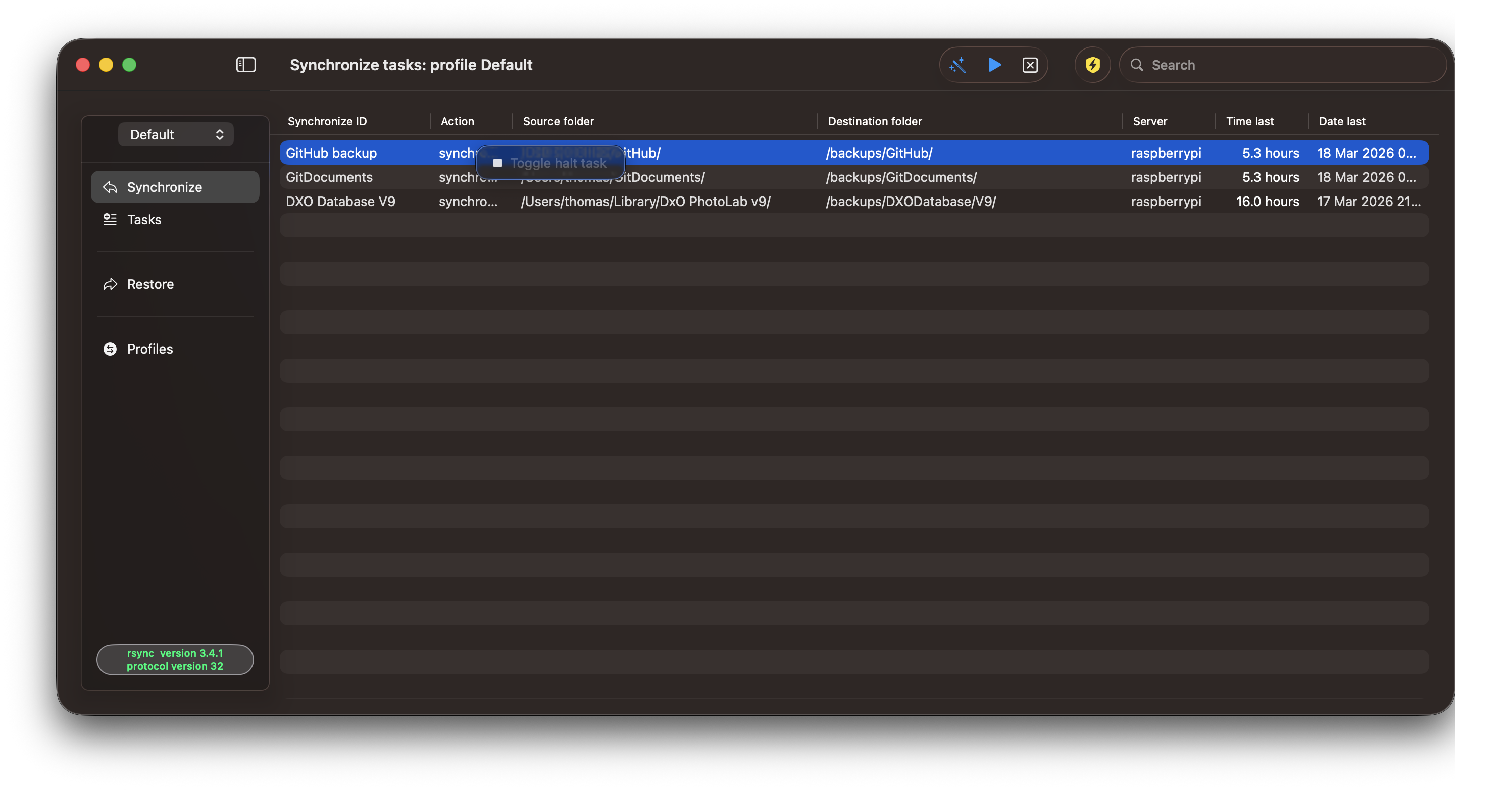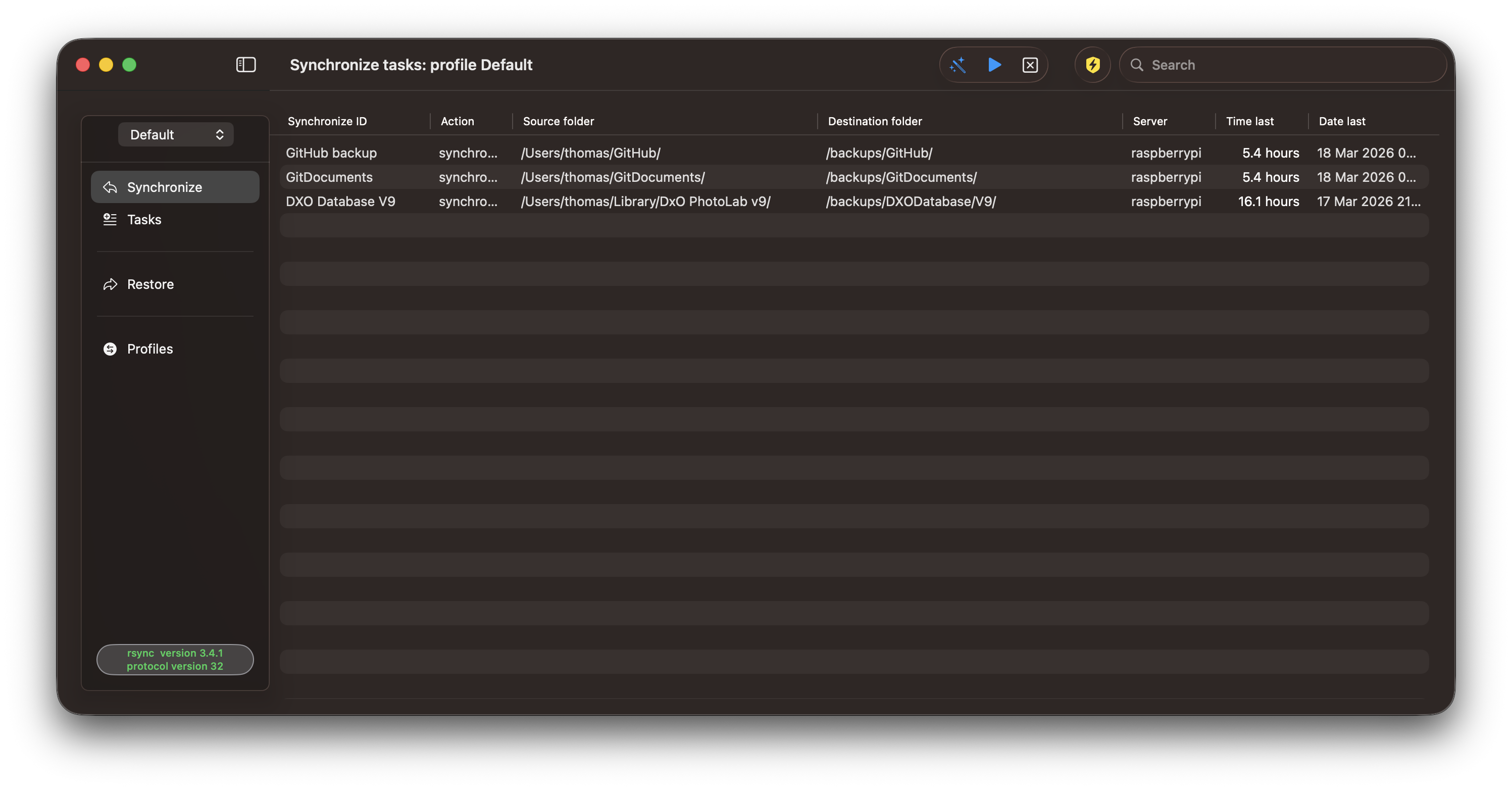 RsyncUI specializes in synchronization and file management. The command-line tool rsync performs the actual work. If you need a full system backup tool that creates complete disk images, RsyncUI is not the right fit.