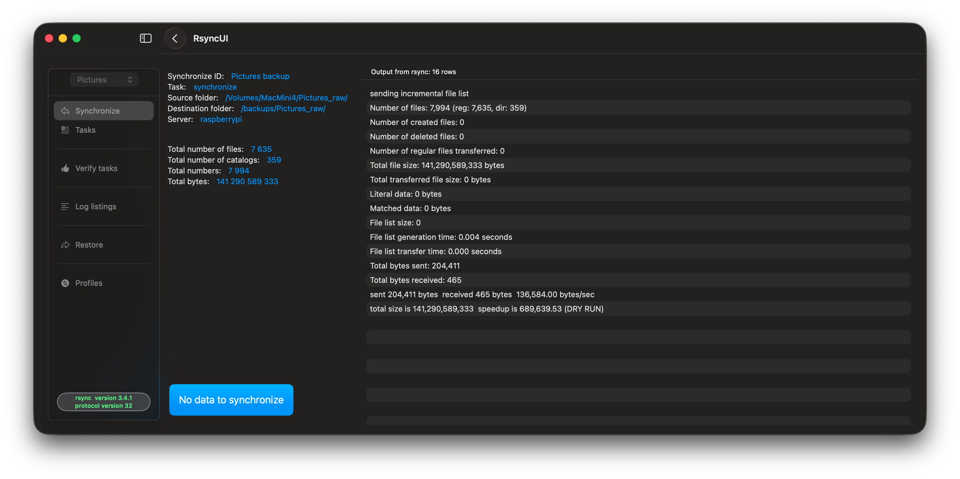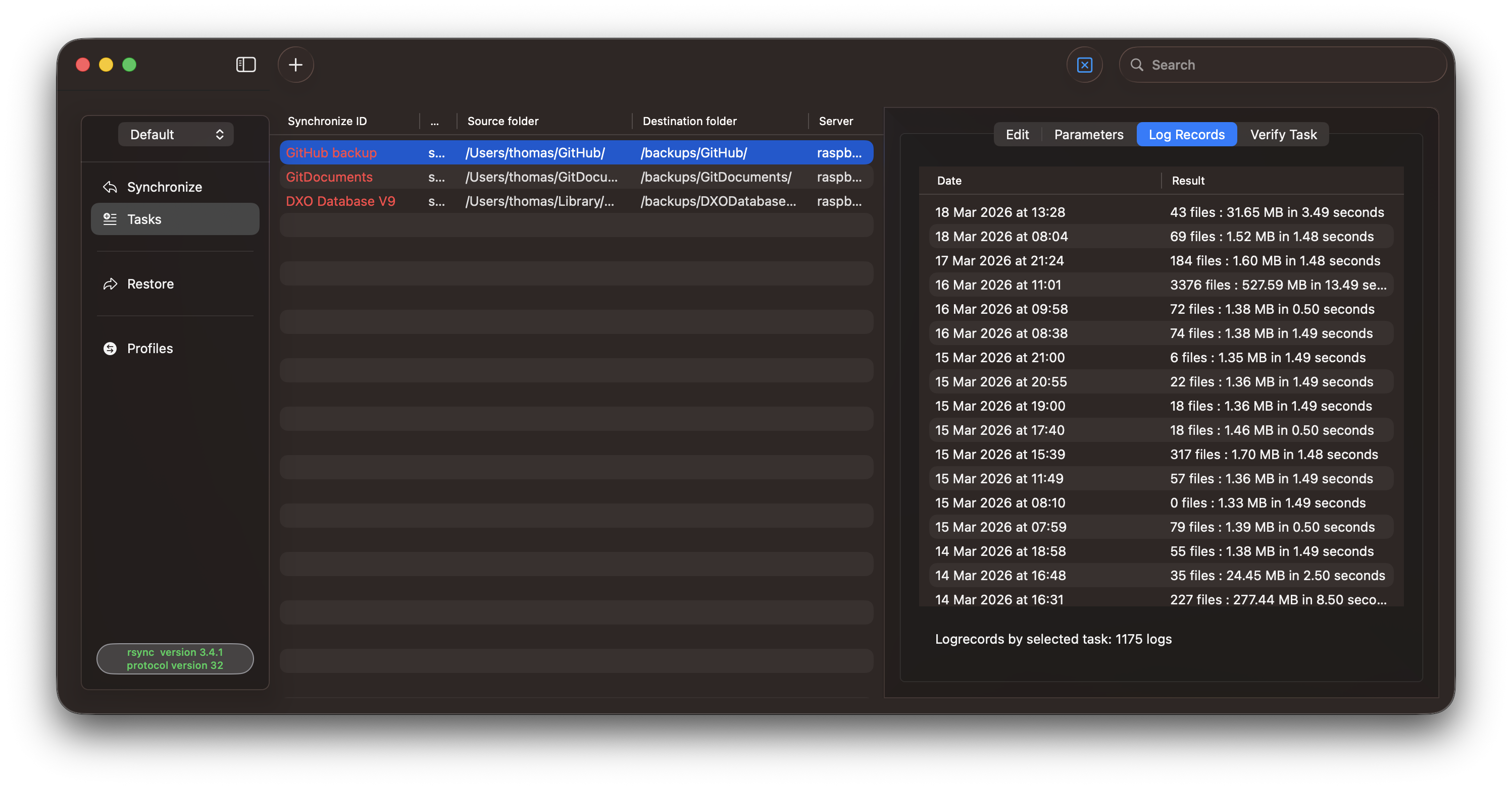 RsyncUI is a desktop-only app with no server component. It does not send logs off your Mac. Task data and logs stay local; you can back them up to your Documents directory from Settings. Data leaves your Mac only when you enable tasks that target a remote server, and you are responsible for securing that data.