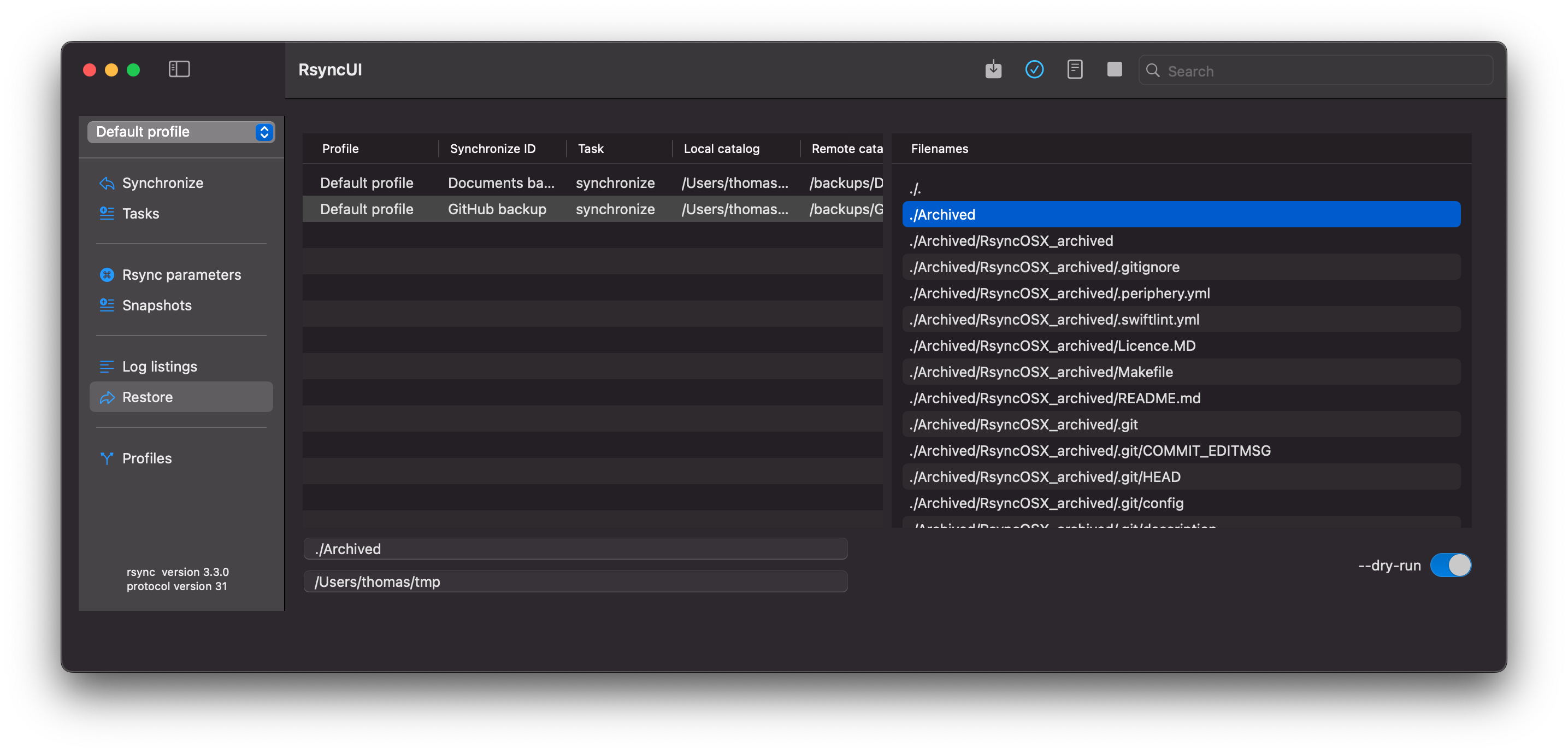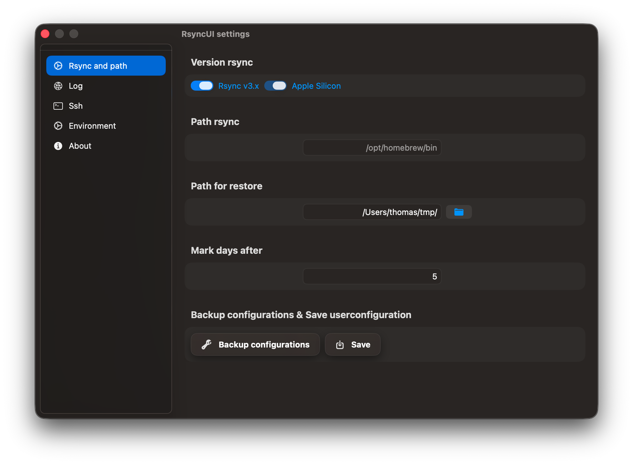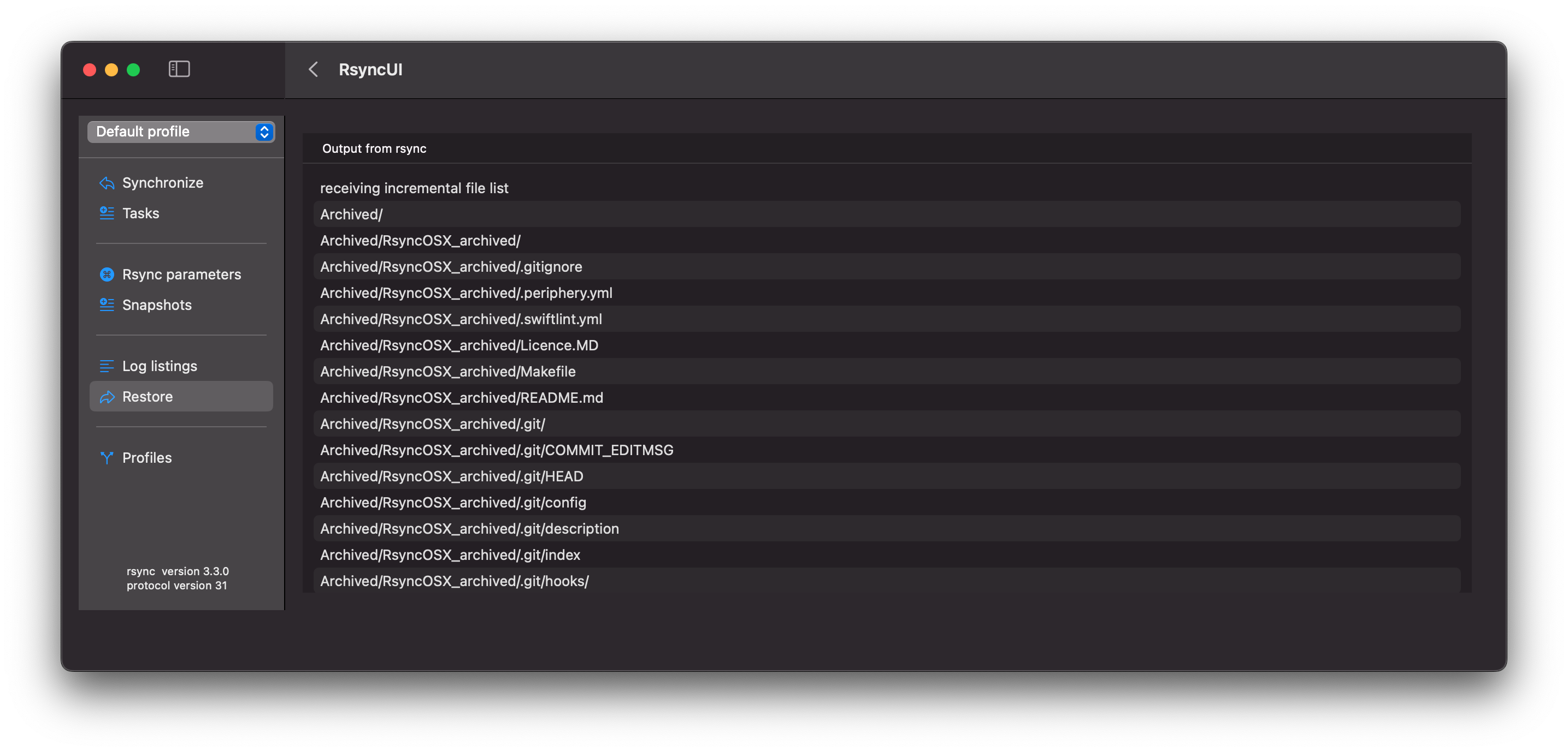 Note: RsyncUI’s snapshot and sync remote features require rsync version 3.x due to limitations in version 2.6.9.