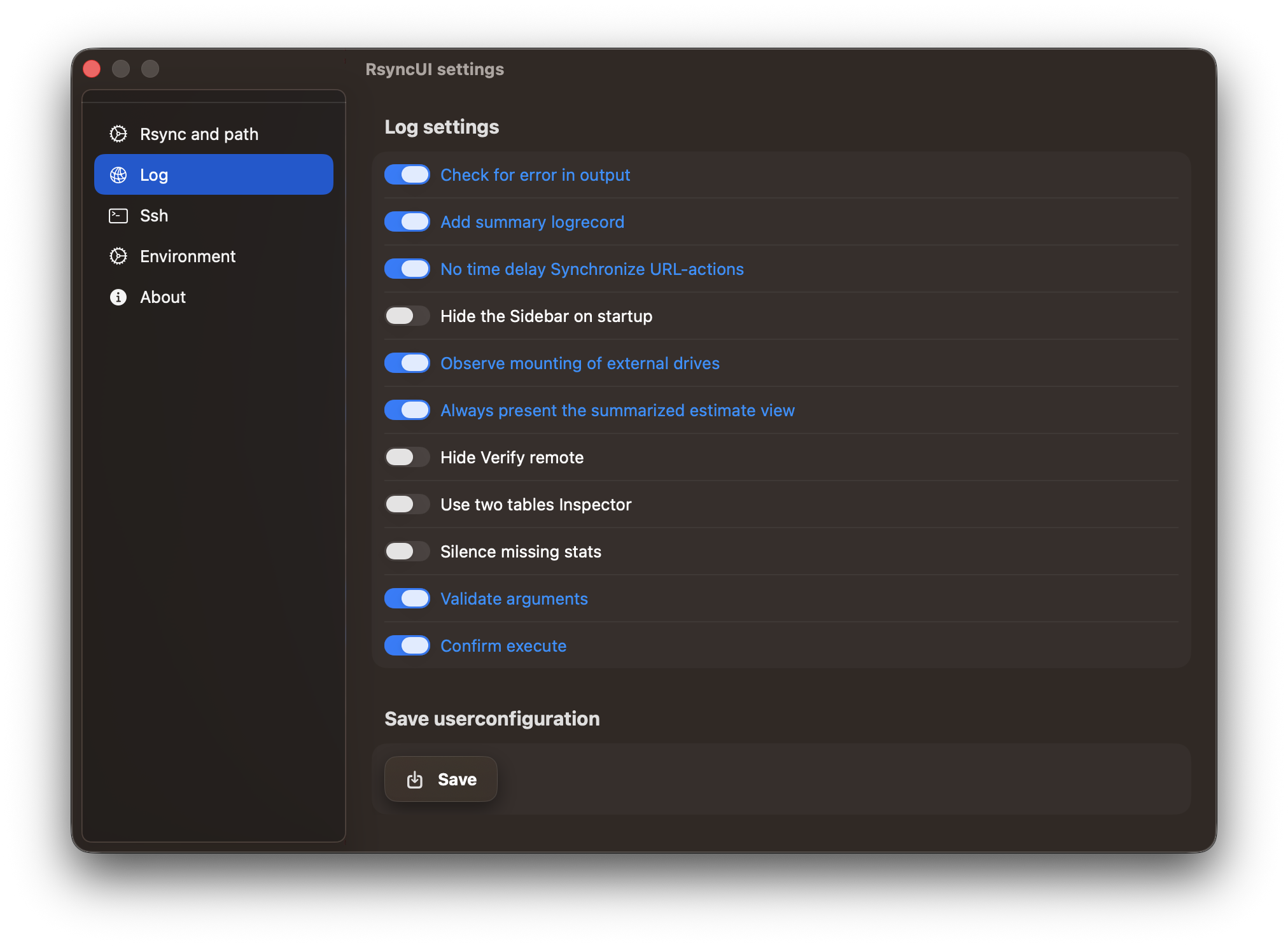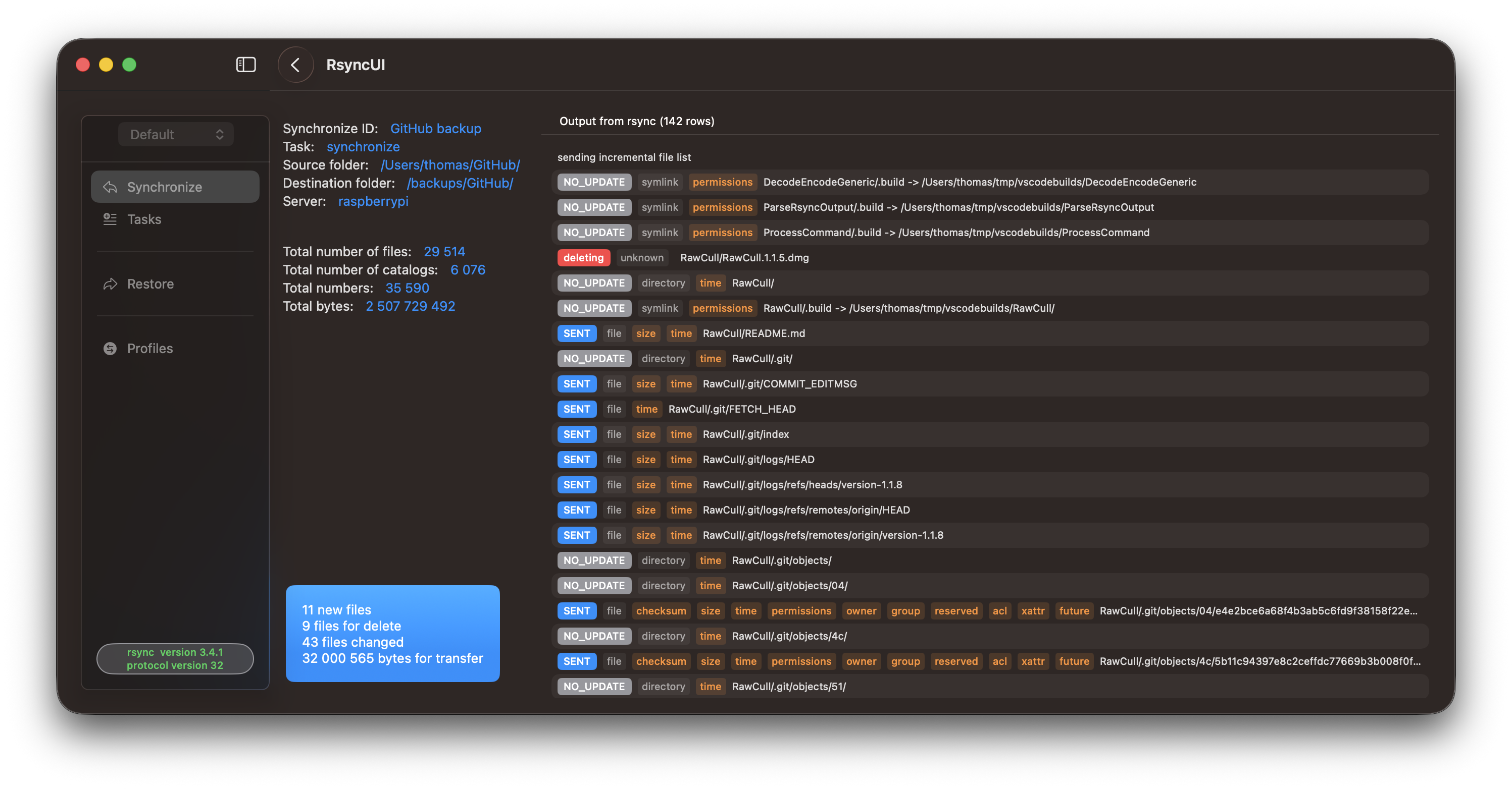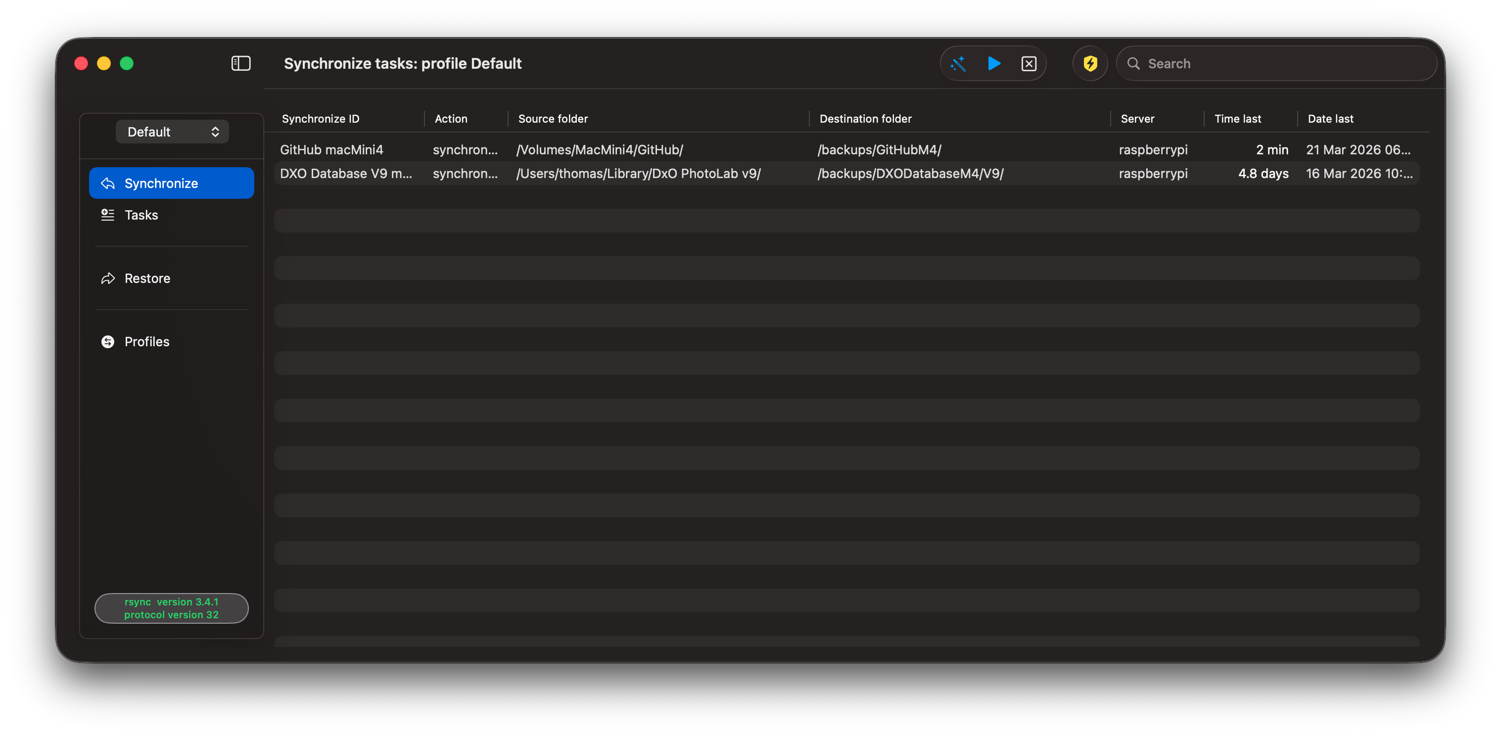 Note: RsyncUI’s snapshot and sync remote features require rsync version 3.x due to limitations in version 2.6.9.