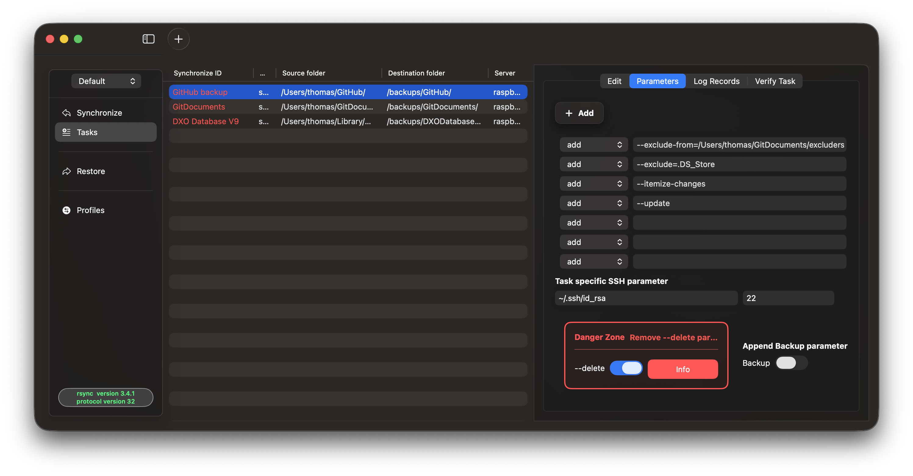 Open Settings → SSH and enter your custom keypath and identity file. RsyncUI will apply these settings to all remote tasks. You can also set per-task SSH parameters in the task’s Parameters tab, which will override the global setting.
