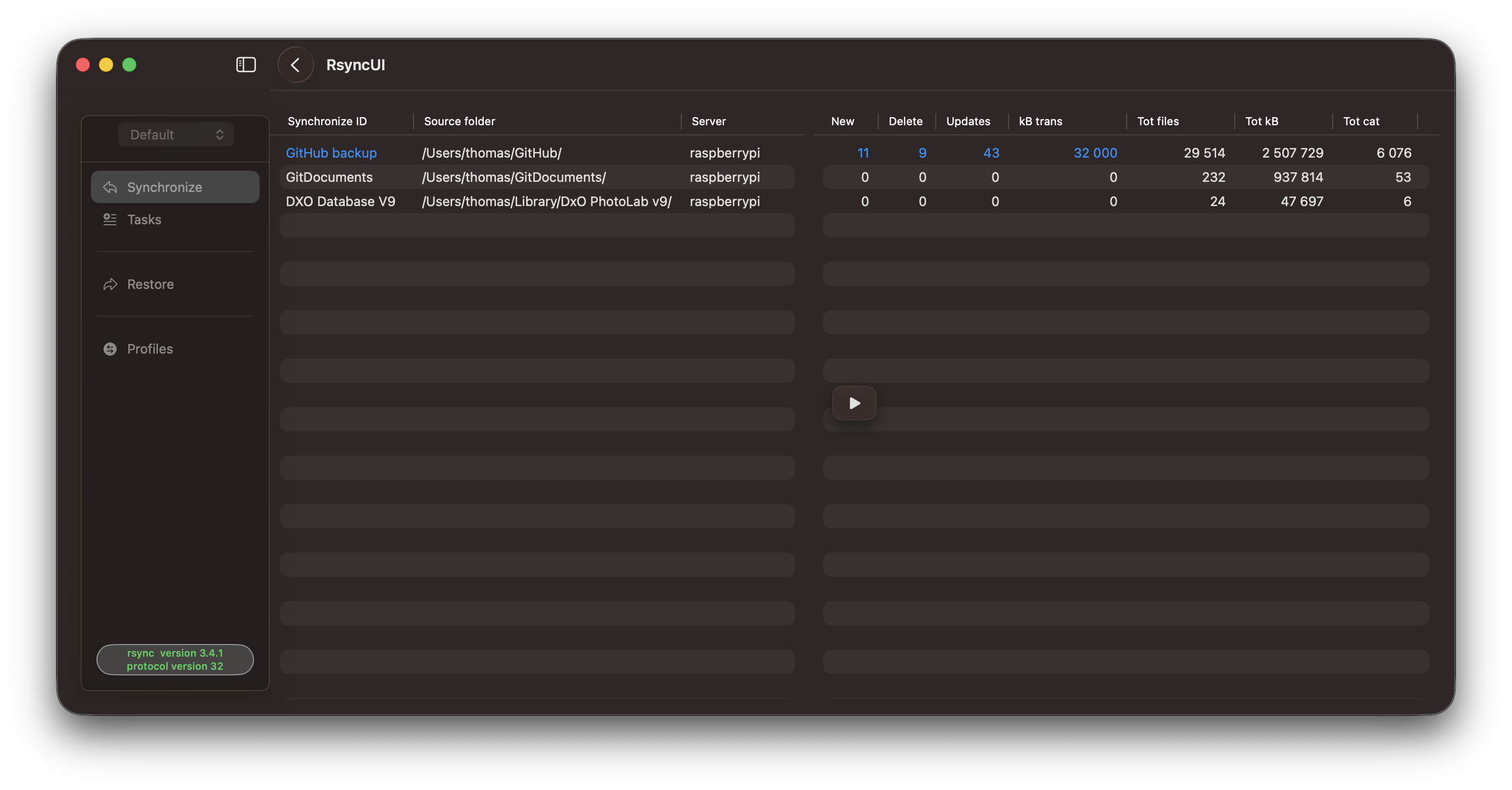 I strongly recommend installing the latest version of rsync (version 3.x) to take full advantage of RsyncUI’s features.